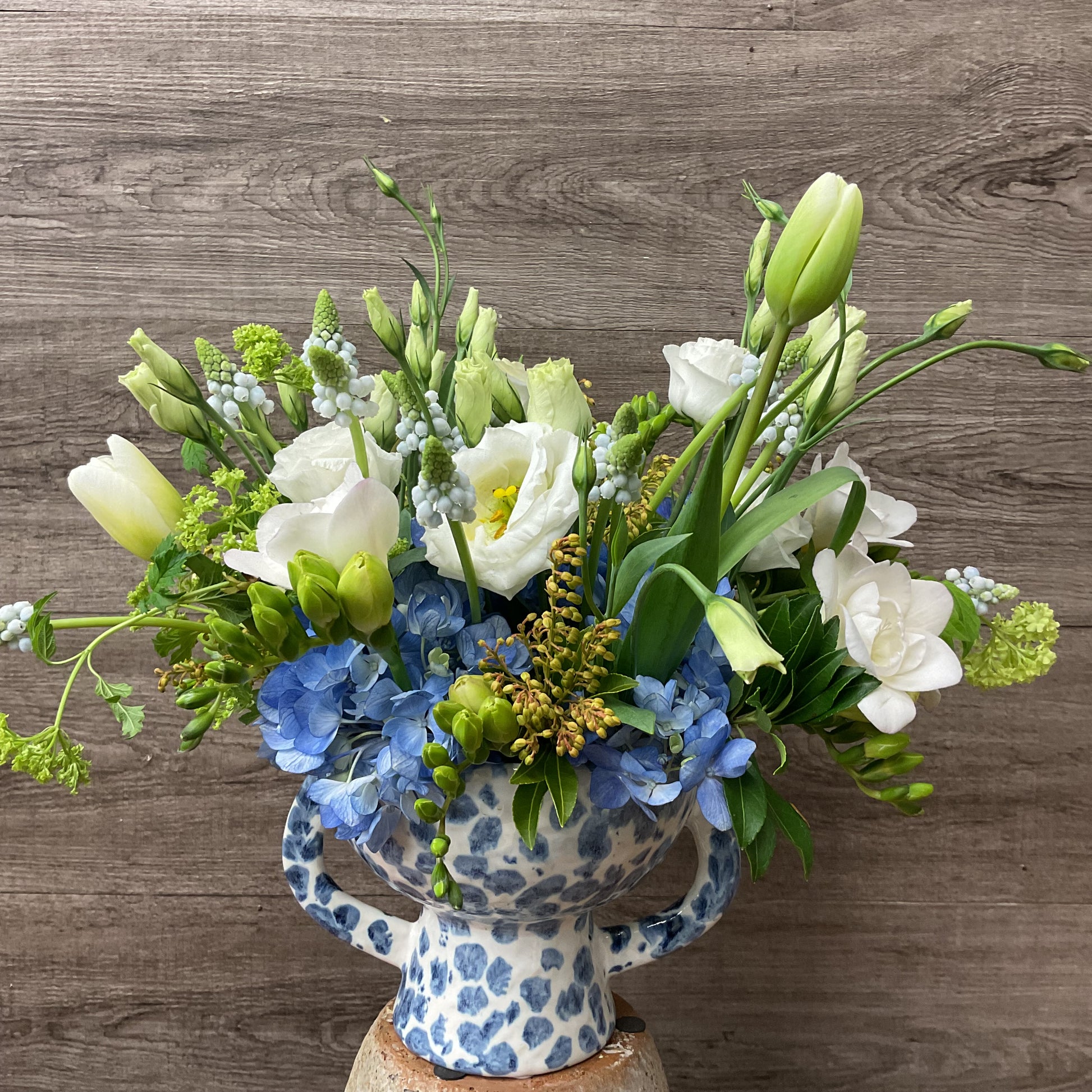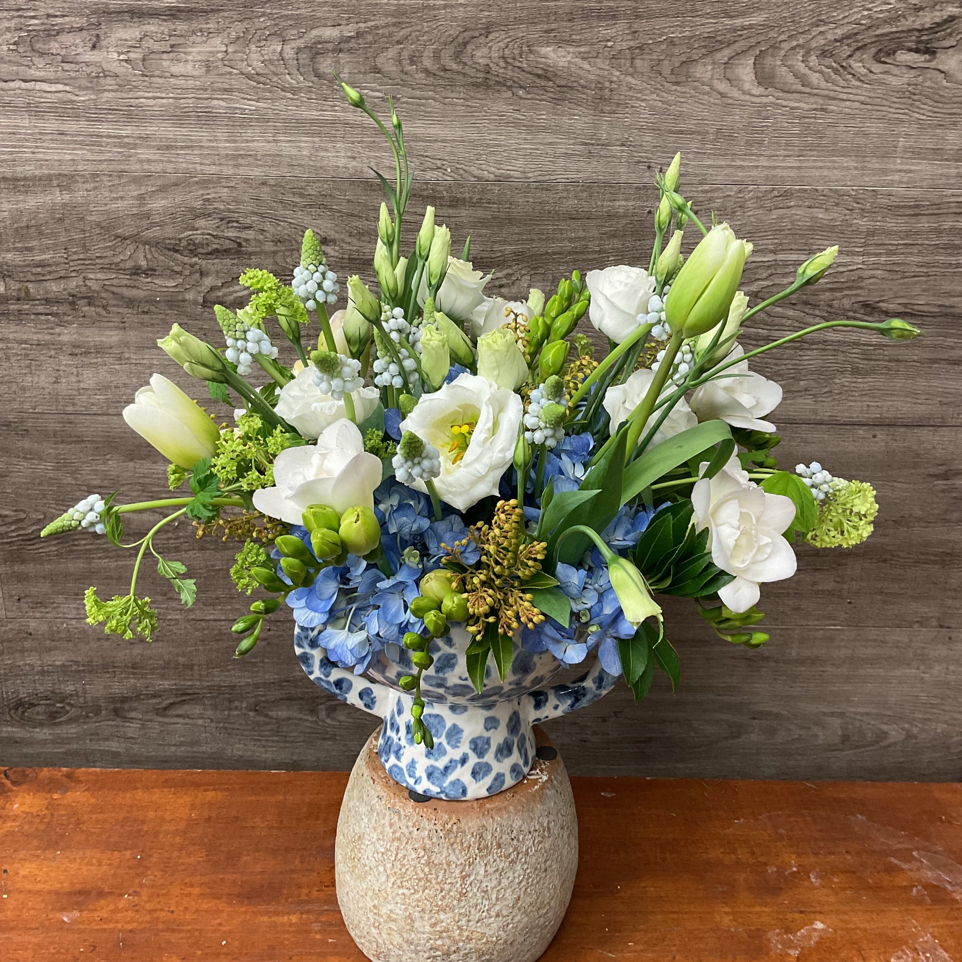 Spring flowers arranged in a beautiful blue and white pot! Flowers may differ from photo.