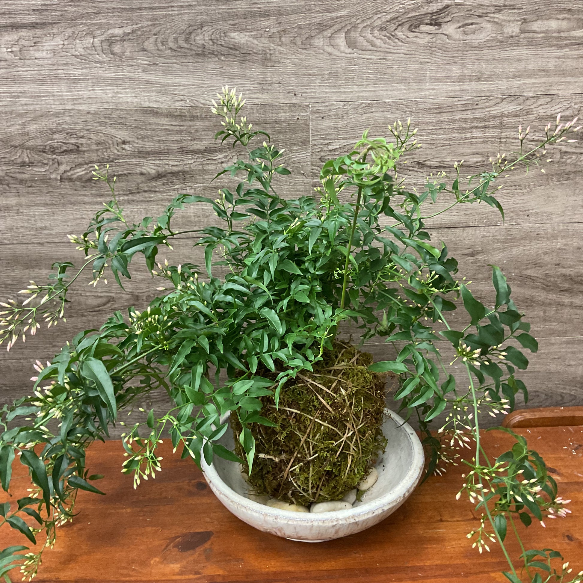 A fragrant jasmine plant wrapped in moss and displayed in a shallow ceramic bowl! Simple beauty. Container included.